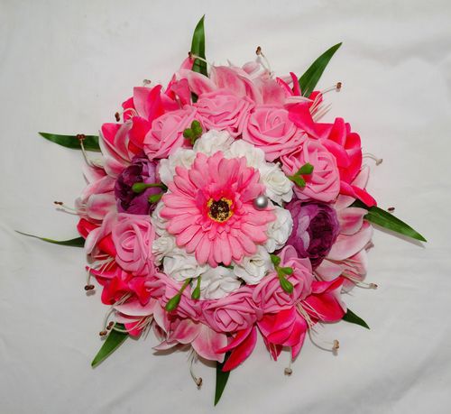 je vous propose également mes créations réalisées avec de jolies fleurs artificielles et éclatantes de couleurs